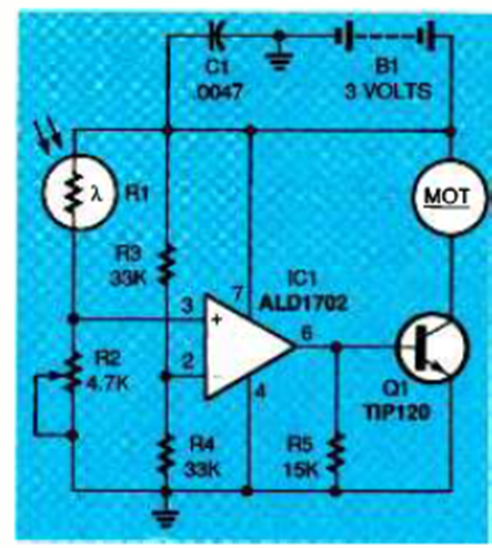 Es un circuito de accionamiento de motor muy simple con un LDR. El circuito simplemente alimenta un pequeño motor. Lo encontramos en Electronics Now, enero de 1997.