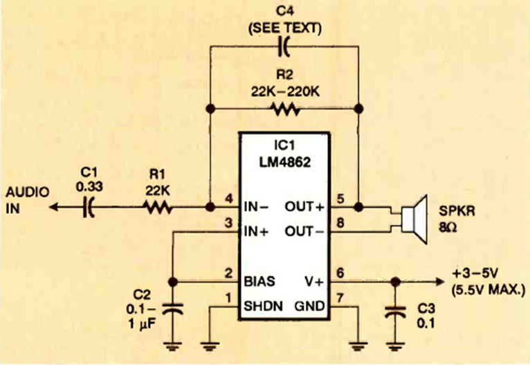 Este pequeño amplificador con la fracción de vatio LM4862 fue encontrado en la edición de noviembre de 1999 de la revista Electronics Now. La fuente de alimentación es de baja tensión.