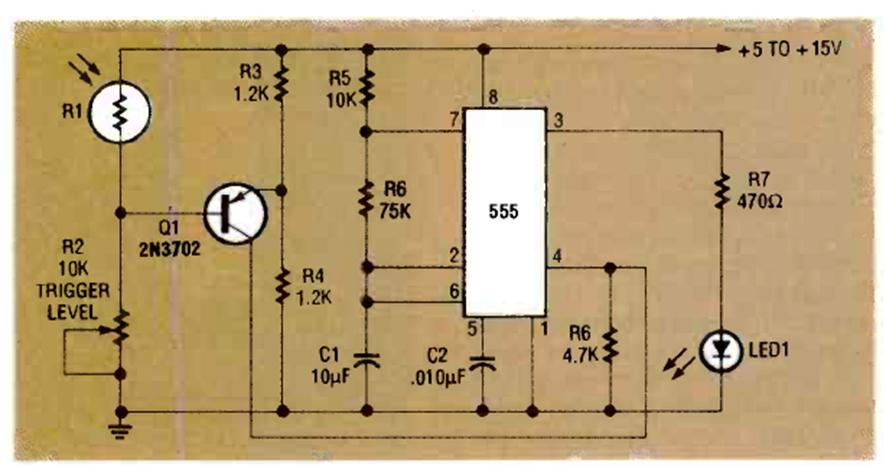 Encontramos este circuito en la edición de noviembre de 1992 de la revista Radio Electronics. El circuito utiliza un LDR como sensor y el transistor puede ser cualquier transistor de propósito general.