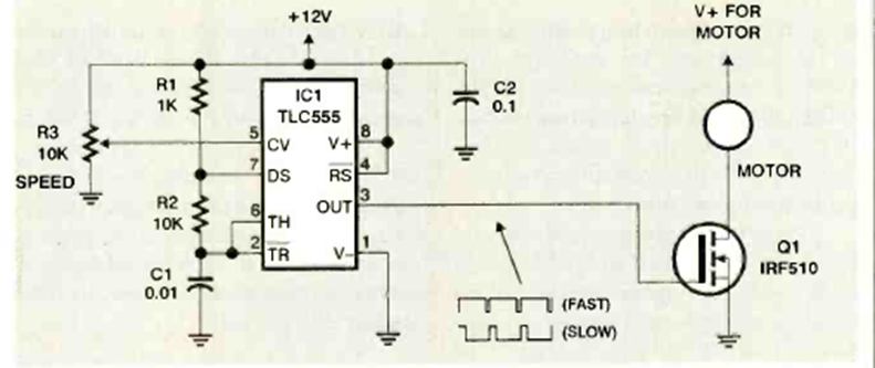 Este circuito simple para motores que depende del MOSFET utilizado fue encontrado en la revista Electronics Now de enero de 1998. La tensión del motor no necesita ser el mismo que el del oscilador.