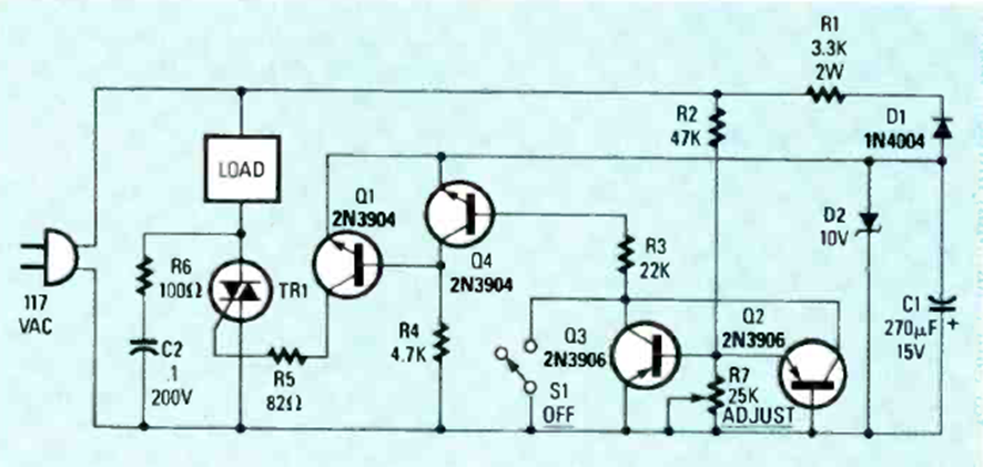 En este circuito el triac conduce cuando se abre el interruptor S1. Lo encontramos en la revista Radio Electronics de octubre de 1987. El triac está determinado por la carga.