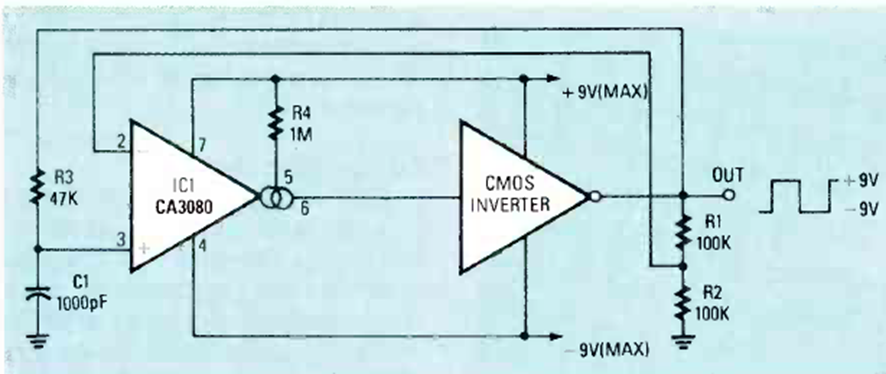 Este circuito genera frecuencias determinadas por R3 y C1. Lo encontramos en la revista Radio Electronics de mayo de 1988. La fuente de alimentación debe ser simétrica.