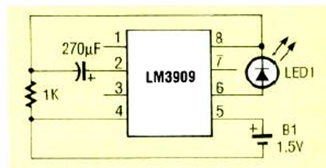 Este circuito se encontró en la edición de enero de 1992 de la revista Radio Electronics. El capacitor determina la frecuencia de los parpadeos. La alimentación proviene de una única pila común.