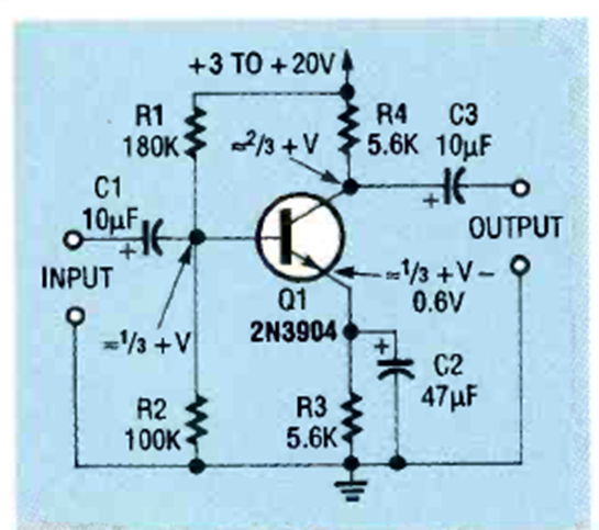 Esta etapa de amplificación de transistores de propósito general se encontró en la edición de noviembre de 1993 de la revista Electronics Now. La polarización se realiza mediante un divisor de tensión.
