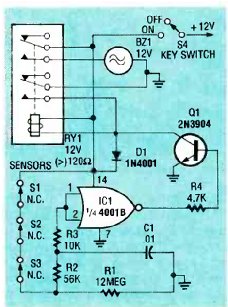 Este sencillo circuito de alarma se encontró en la edición de mayo de 1990 de la revista Radio Electronics. El circuito se alimenta con la tensión del relé y se pueden utilizar más sensores.