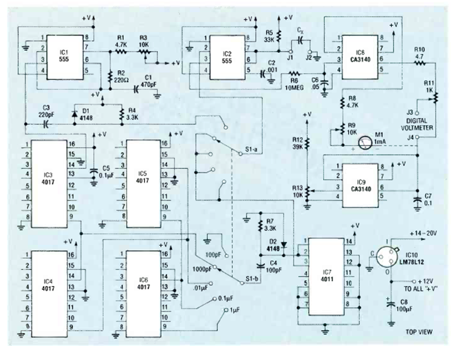 Este circuito le permite leer capacitancias en un instrumento analógico común. Es parte de un artículo de la revista Radio Electronics de abril de 1990.