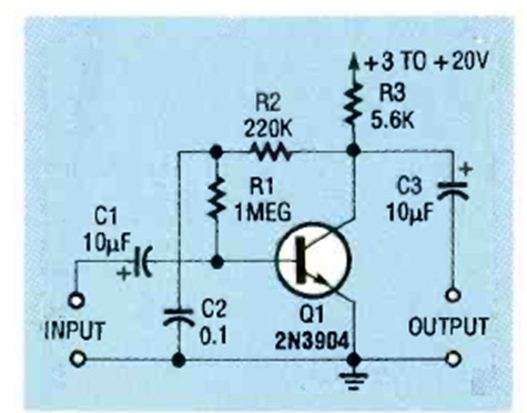 Este circuito para uso de transistores genera una buena ganancia y alta impedancia de entrada. Lo encontramos en la revista Electronics Now de noviembre de 1993.