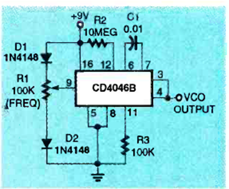 Encontrado en la revista Electronics Now de agosto de 1994, este circuito CMOS utiliza el 4046, lo cual es poco común hoy en día.