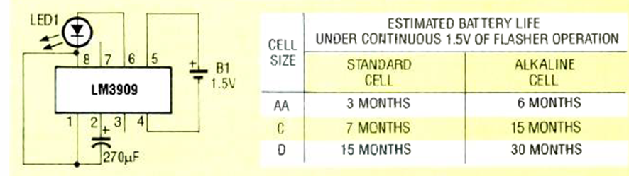 Este circuito puede funcionar hasta 30 meses utilizando pilas alcalinas como se muestra en la tabla al lado del diagrama. El circuito es de una Radio Electronics de enero de 1992.