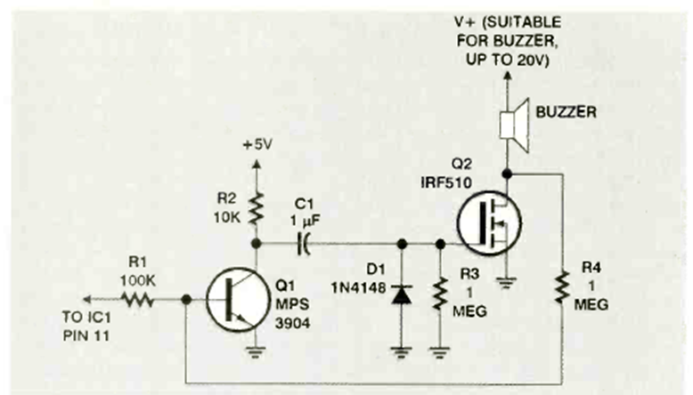 Apto para activación mediante microcontroladores, este circuito fue encontrado en la revista Radio Electronics de diciembre de 1987. El MOSFET puede ser de cualquier tipo según el zumbador.