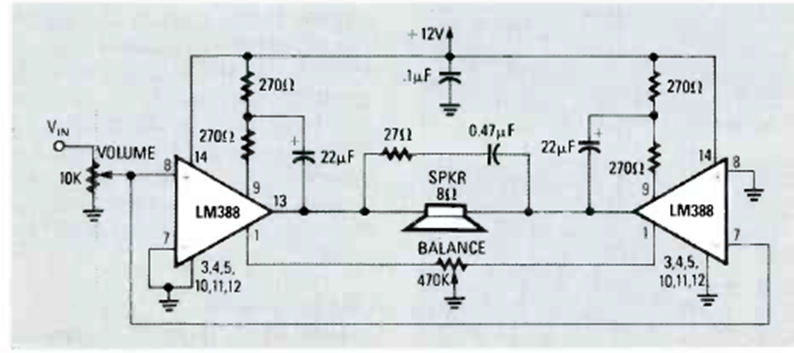 Este circuito de puente está diseñado para altavoces de 8 ohmios que ofrecen una potencia de unos pocos watts. El circuito es de un Radio Electronics de marzo de 1990.