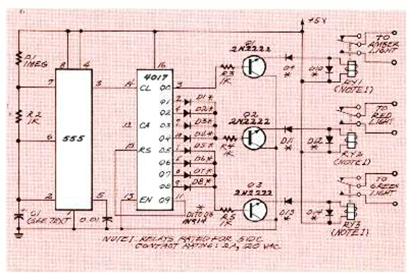 Este circuito realista tiene tiempos más largos para las luces verde y roja, y tiempos más cortos para las amarillas. El circuito es de Electronics Now de mayo de 1994.