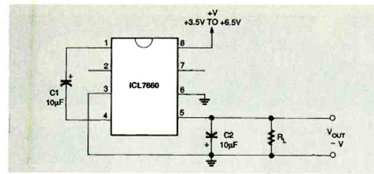Este circuito de polarización negativa proporciona voltajes negativos de fuentes de 3,5 a 6,5 V. El circuito fue encontrado en la edición de abril de 1995 de la revista Electronics Now.