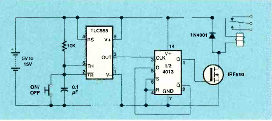 Este circuito biestable que acciona un relé con un pulsador fue encontrado en la edición pp6 del 1 de marzo de la revista Electronics Now. Se puede utilizar un bipolar común con una resistencia de 1k en la base en lugar del FET.