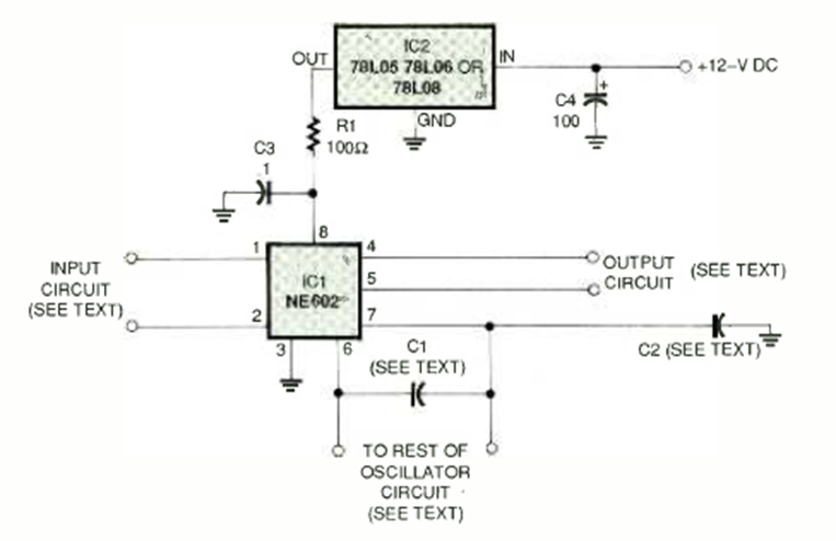Este circuito fue encontrado en la revista Electronics Now de febrero de 1997. El circuito tiene una fuente de alimentación para el NE602 y entradas y salidas libres para proyectos.