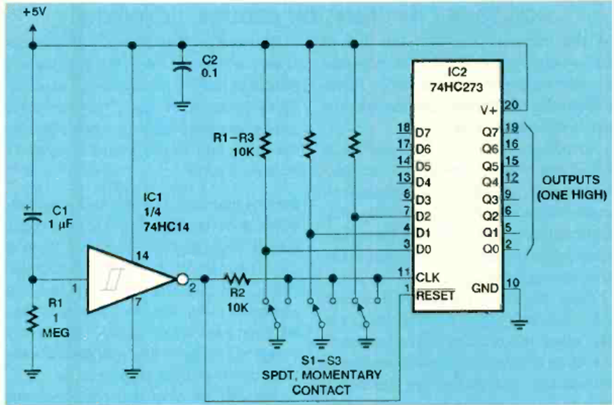 Este circuito simula un interruptor multiposición a través de botones de programación. El circuito es de una revista Electronics Now de septiembre de 1998.