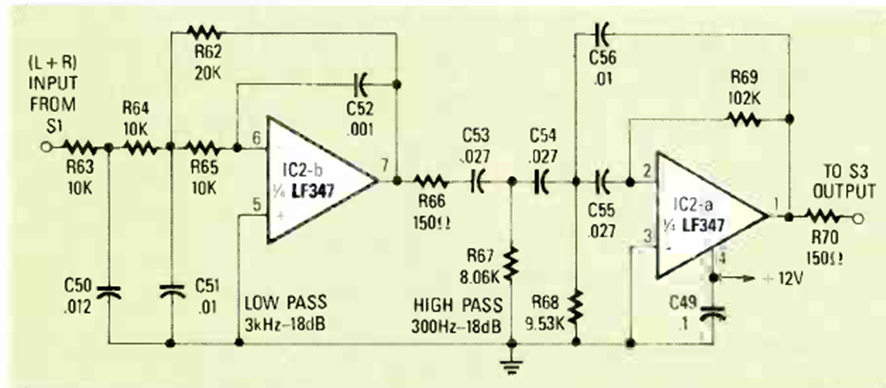Este circuito fue presentado en un artículo de la revista Radio Electronics de enero de 1990 como parte de un sistema de efectos de sonido para un cine en casa. Consiste en un filtro paso alto de 3 kHz.