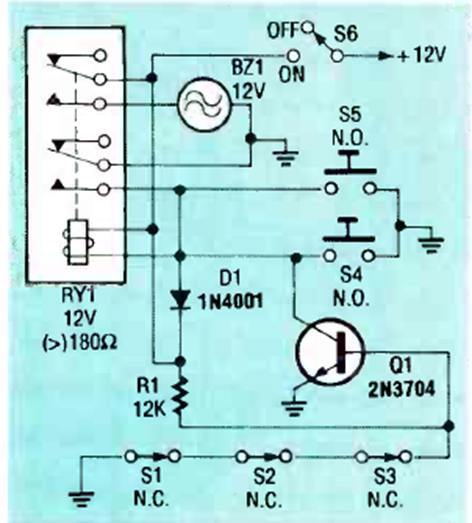 Este circuito se encontró en la edición de mayo de 1990 de la revista Radio Electronics. El transistor es de propósito general y la tensión de alimentación depende del relé utilizado.
