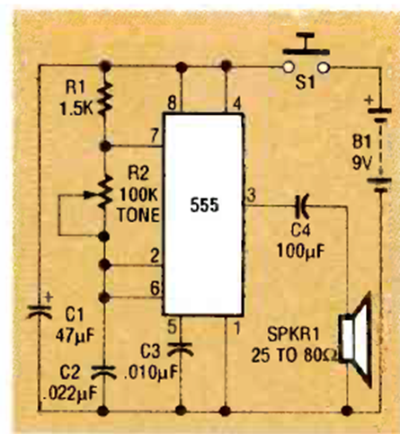 Este sencillo circuito se encontró en la edición de noviembre de 1992 de la revista Radio Electronics. Genera un tono cuya frecuencia está establecida en R2. Puede ser alimentado por una fuente de alimentación.