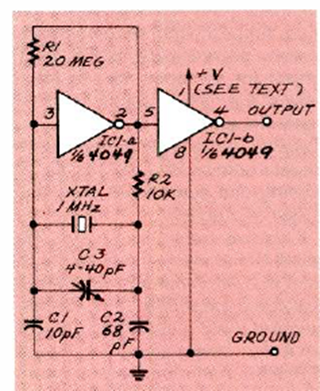 Este oscilador de 1 MHz se encontró en la edición de febrero de 1992 de la revista Radio Electronics. La frecuencia la proporciona el cristal y se puede cambiar.