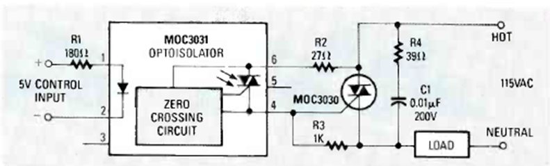 Este circuito utiliza un optoacoplador con un fototriac para accionar un triac externo. El circuito es de una revista Radio Electronics de diciembre de 1989.