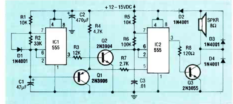 Este circuito de alerta roja de la película Star Trek se encontró en la edición de julio de 1990 de la revista Radio Electronics. El transistor de potencia debe estar equipado con un disipador de calor.