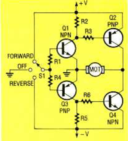 Este circuito utiliza un interruptor para seleccionar la dirección de rotación de un motor de CC. Lo encontramos en la revista Electronics Now de noviembre de 1993. Observe el uso de una fuente simétrica.