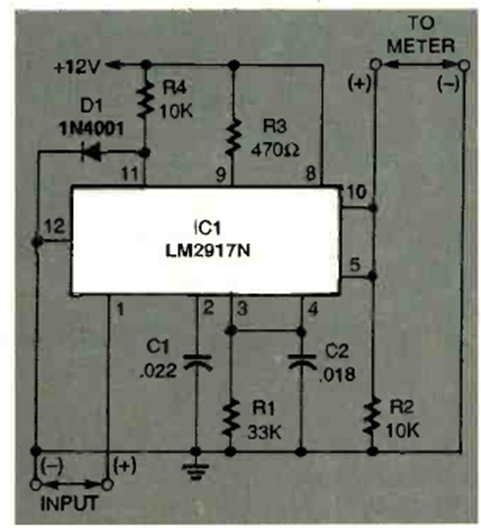 En este circuito es posible medir frecuencias de hasta 10 kHz utilizando un multímetro digital o el 7107. El circuito es de una revista Eletrctronics Now de noviembre de 1996.