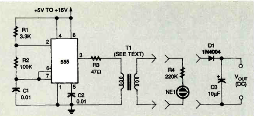 Este circuito de muy baja corriente fue encontrado en la edición de abril de 1995 de la revista Electronics Now. La frecuencia debe elegirse para lograr la máxima eficiencia de acuerdo con el pequeño transformador utilizado.