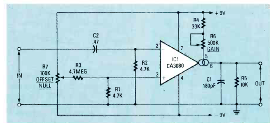 Este amplificador con ganancias entre 5 y 100 fue encontrado en la edición de mayo de 1988 de la revista Radio Electronics. El circuito requiere una fuente de alimentación simétrica.