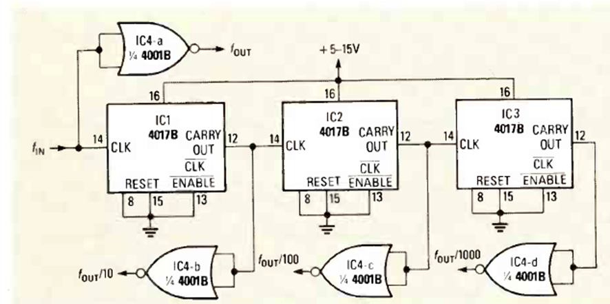 Con este circuito se pueden conectar en serie cualquier número de 4017 circuitos integrados. El circuito es de una Radio Electronics de abril de 1989.