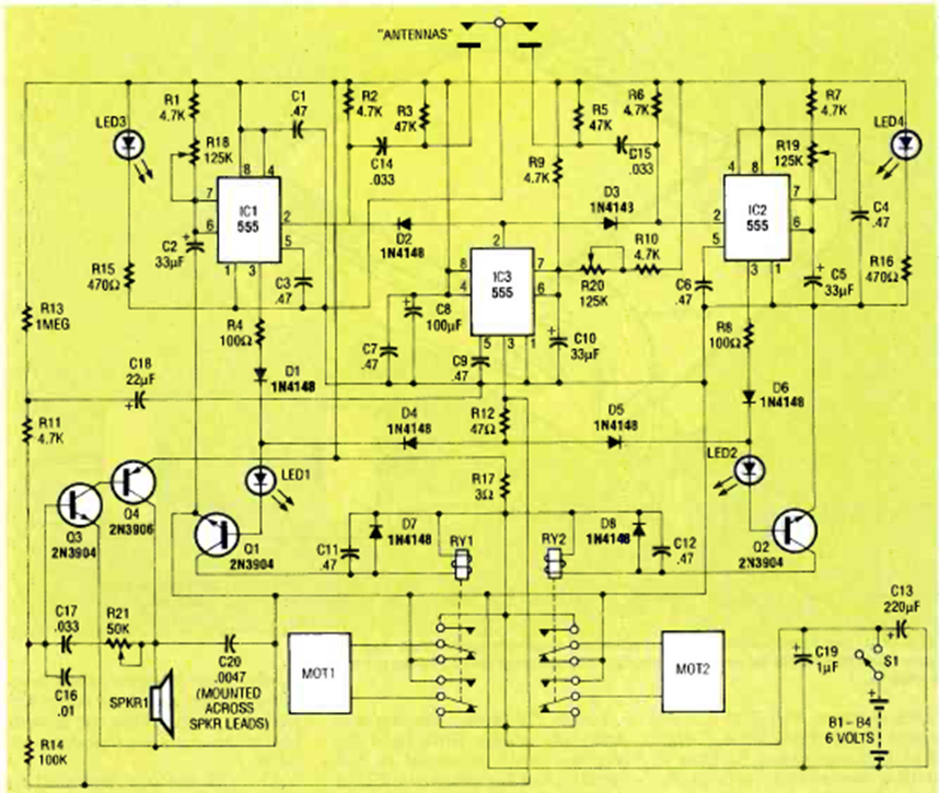 Este es un circuito robótico publicado en la edición de junio de 1992 de la revista Radio Electronics. Los sensores se utilizan para accionar dos motorreductores. La energía es proporcionada por baterías.