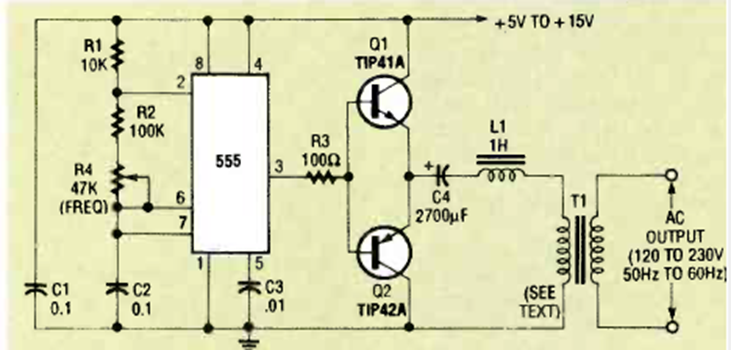 Se puede obtener un voltaje no sinusoidal de 120 V con este circuito que se encuentra en la revista Radio Electronics de diciembre de 1992. La potencia es de unos pocos watts.