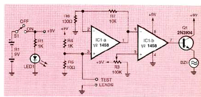 Encontramos este circuito en la revista Electronics Now de agosto de 1994. El circuito se basa en el circuito operacional dual MC1458 que es equivalente al 741. La indicación es mediante un zumbador.