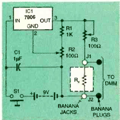 Este medidor de resistencia muy baja fue encontrado en la edición de febrero de 1995 de la revista Electronics Now. El circuito se basa en una fuente de corriente constante con el 7806.