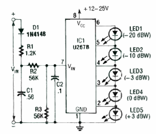 El circuito fue encontrado en la revista Radio Electronics de febrero de 1992. La escala se puede cambiar modificando R2 y R3.