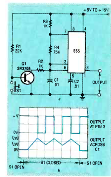 Encontrado en la revista Radio Electronics de octubre de 1992, este oscilador está controlado por el interruptor S1. La frecuencia depende de C1 y se puede cambiar.