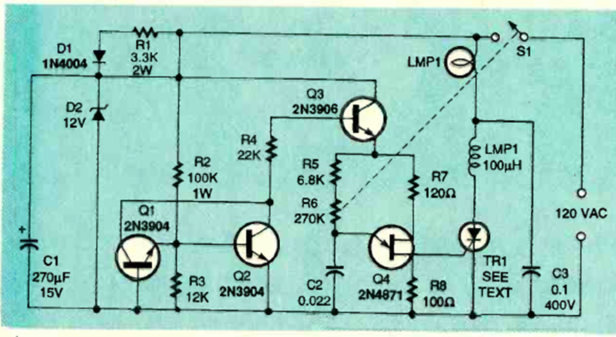 Este regulador (dimmer) de intensidad para red eléctrica de 120 V (117 V) se encontró en la revista Electronics Now de agosto de 1995. El triac es de acuerdo a la carga la cual debe ser óhmica.