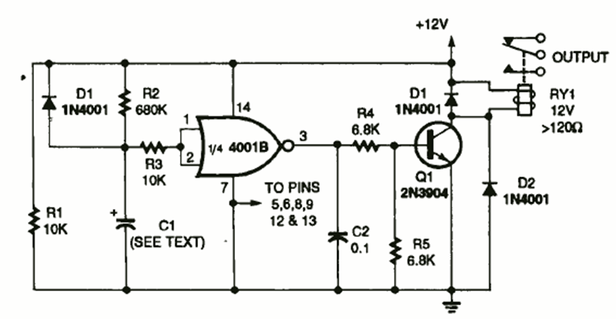 Este circuito se apaga después de un tiempo dado por el condensador C1. Este componente puede tener de 1 a 1000 uF dependiendo del tiempo deseado. El circuito es de Electronics Now de junio de 1995.
