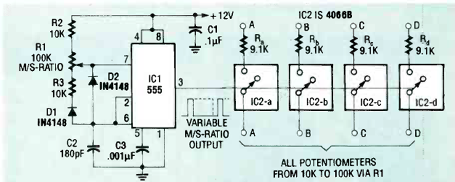 Con este circuito es posible variar la resistencia ajustando la reacción marca/espacio del 555. El circuito fue encontrado en la edición de noviembre de 1989 de la revista Radio Electronics.