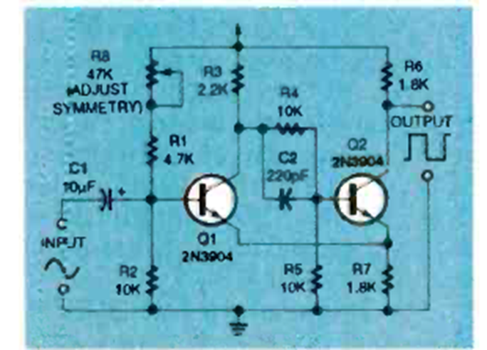 Este disparador Schmitt, que convierte señales rectangulares en cuadradas, se encontró en la edición de enero de 1994 de la revista Electronics Now. El circuito utiliza transistores comunes de propósito general.
