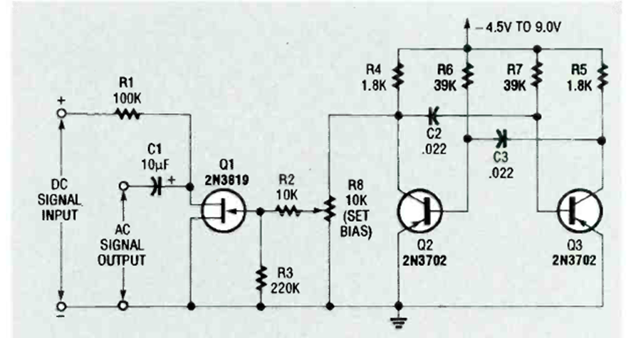 Encontramos este circuito que convierte una tensión directa en una señal de frecuencia proporcional. El circuito es de Electronics Now de abril de 1993. El JFET puede ser de cualquier tipo.
