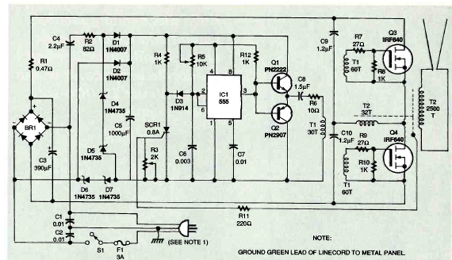 La escalera de Jacob es un dispositivo de efectos de alta tensión en el que una chispa pasa entre dos conductores en V, desapareciendo al final y comenzando un nuevo ciclo. El circuito que se muestra es de Electronics Now de diciembre de 1995;