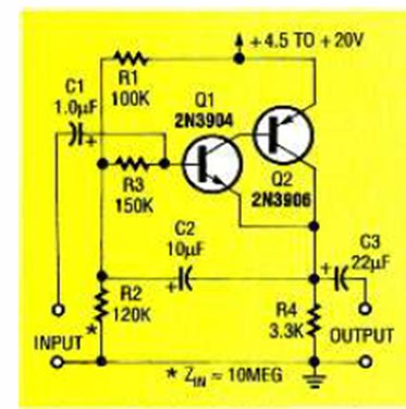 Este circuito tiene una impedancia de entrada de 10 M ohmios. Lo encontramos en la revista Electronics Now de octubre de 1993. El circuito utiliza transistores comunes de propósito general.