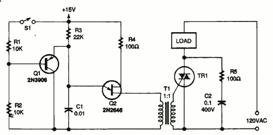 Este circuito de control de potencia se encontró en un artículo en la edición de junio de 1995 de la revista Electronis Now. El circuito utiliza un transformador de disparo.