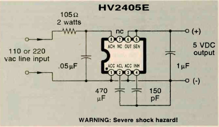 Este circuito de fuente de alimentación sin transformador de baja corriente se encontró en la edición de agosto de 1998 de la revista Electronics Now. El circuito suministra unas decenas de miliamperios y ya incluye la etapa rectificadora.