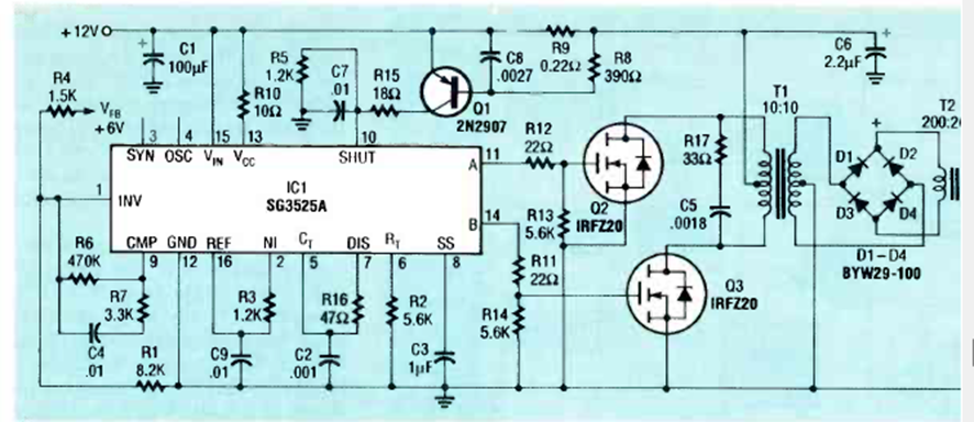 Este circuito es de una revista Radio Electronics de abril de 1991. El circuito utiliza transistores MOSFET de potencia y un circuito integrado de la época.