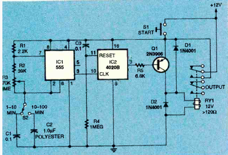 Utilizando el 555 y el 4020, este temporizador fue encontrado en la edición de julio de 1994 de la revista Radio Electronics. El relé depende de la tensión y el transistor es de propósito general.