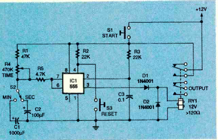 Este temporizador de hasta 10 minutos fue encontrado en la revista Radio Electronics de julio de 1994. El relé debe ser sensible a la tensión de alimentación utilizada. Los condensadores determinan los rangos de tiempo.