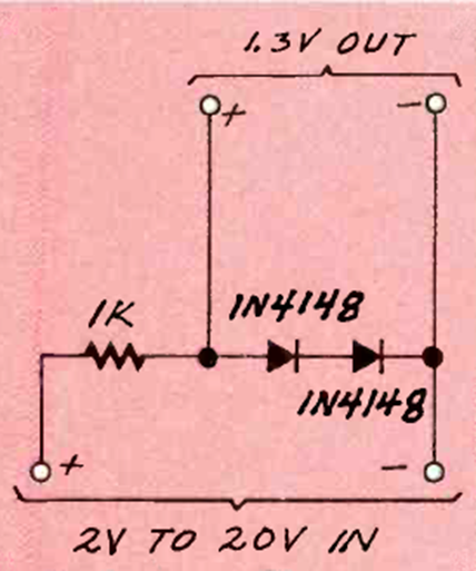 Este circuito se basa en la caída de tensión de los diodos en conducción, en el orden de 1,6 a 1,7 V. La corriente es muy baja y la entrada puede estar en el rango de tensión indicado.
